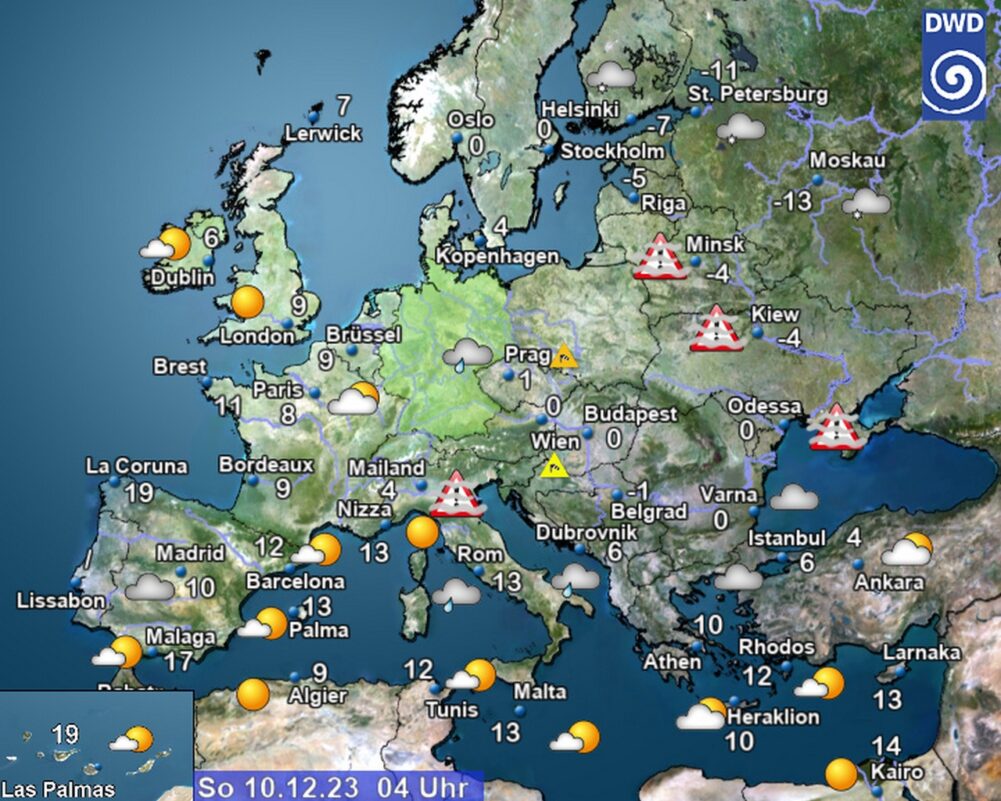 Heute am Tage im Norden und in der Mitte überwiegend stark bewölkt bis bedeckt und zeitweise Regen. Im Süden und Südwesten wechselnd bewölkt und nur vereinzelt Regen. Überwiegend mild bis sehr mild bei Höchstwerten zwischen 3 Grad in Vorpommern und bis zu 12 Grad am südlichen Oberrhein. Meist mäßiger bis frischer Südwestwind mit steifen, in höheren Lagen sowie anfangs an der Nordsee stürmischen Böen. (DWD)