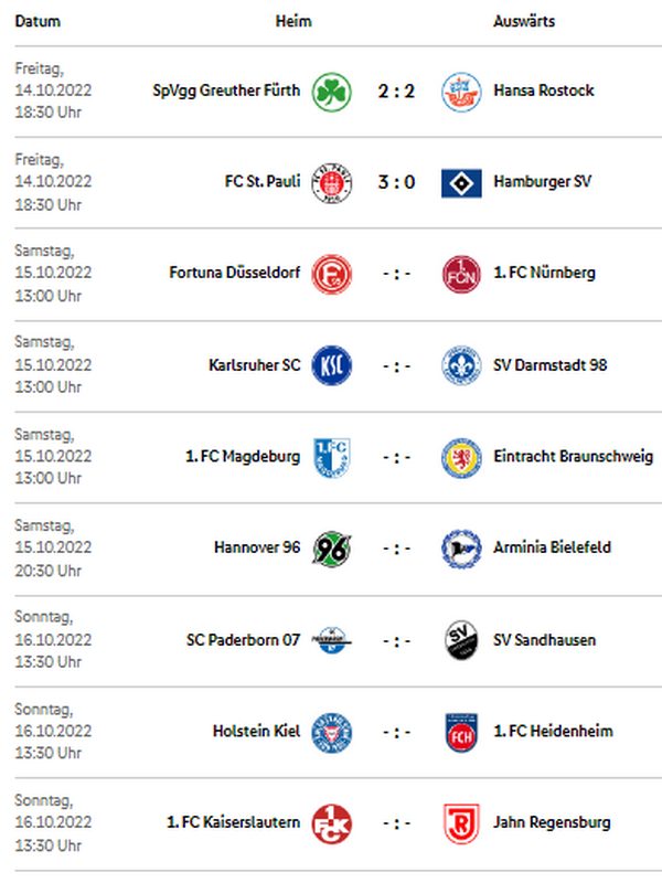 15 Okt. 2022 2. FuĂball-Bundesliga: 12. SPIELTAG / Freitagsspiele von pdppredaktion | Veröffentlicht in: FuĂball | 0 SPIELTAG (14.10.2022 – 16.10.2022)Tabelle:Quelle DFB