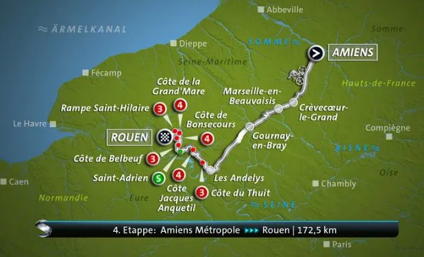 Einschätzung: Weiter tourt das Peloton durch Nordfrankreich – und wie immer in dieser Region könnte der Wind ein Thema werden. Zwischen der Stadt Amiens, die fĂĽr ihre riesige Kathedrale berĂĽhmt ist, und Rouen, der Hauptstadt der Normandie, sind 173 durchaus wellige Kilometer zu absolvieren. Sicherlich werden AusreiĂźer ihr GlĂĽck versuchen, während sich die Anwärter auf den Gesamtsieg der Tour weiter vornehm zurĂĽckhalten können. Die letzten 40 Kilometer sind anspruchsvoll mit vielen kleinen bis mittleren Anstiegen – hier bekommt das Profil Klassiker-Charakter. Die letzten fĂĽnf Kilometer ins Ziel in Rouen werden in rasender Abfahrt bewältigt.