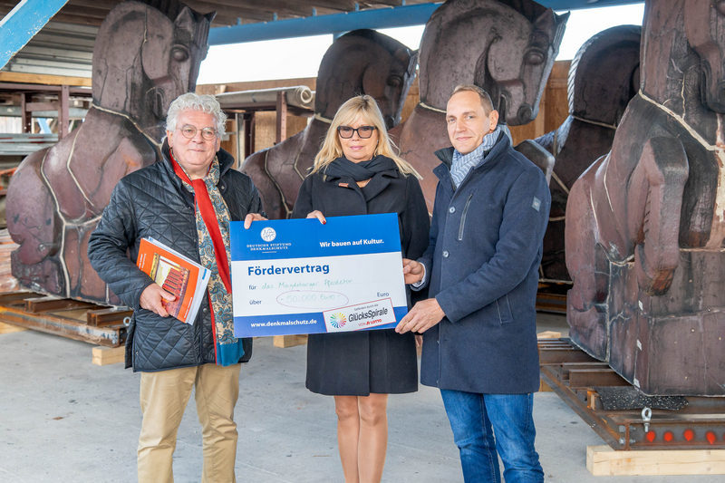 Die Förderung wurde auf dem Firmengelände des Familienunternehmens Paul Schuster GmbH überreicht. Dort lagern aktuell die gesicherten Pferdeskulpturen und werden restauriert. Das erste Pferd war im November 2024 abmontiert und mit einem Kran heruntergehoben worden. Da es zu dem Denkmal keine Pläne gibt, musste die Demontage behutsam und kleinschrittig erfolgen. Der Schwerpunkt der Skulptur musste ausgelotet werden, um ein sicheres Herunterheben zu gewährleisten. Bereits vorher stand fest, dass Wasser in die Pfeiler eingedrungen war. In der Draufsicht war zu erkennen, dass diese bauchig aufgequollen waren und zahlreichen Risse aufwiesen. Die Skulpturen waren ebenfalls ein einem schlechten Zustand und sollen nun nach knapp 100 Jahren am Platz pünktlich zum Jubiläum 2027 wieder erstrahlen.