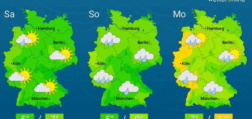 Nach einem vielfach nassen und sehr windigen Sonntag ziehen die NiederschlĂ€ge zum Start in die neue Woche ab. AnschlieĂend setzt sich in den sĂŒdlichen Landesteilen zunehmend Hochdruckeinfluss durch. Zu den KĂŒsten hin bleibt es wolkig, windig und gelegentlich fĂ€llt etwas Regen. Dabei steigen die Temperaturen teils ĂŒber die 10-Grad-Marke an, aber nur im SĂŒden lĂ€sst sich dazu regional auch lĂ€nger die Sonne blicken. In den dort oft klaren NĂ€chten gibt es besonders zu den Alpen hin leichten, örtlich auch mĂ€Ăigen Frost.