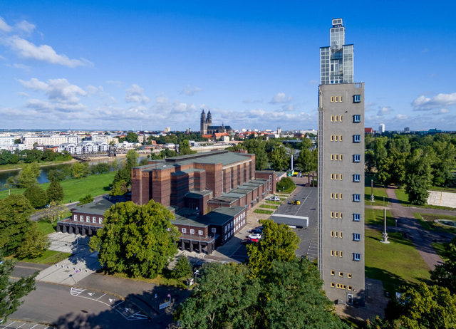 Der insgesamt 61 Meter hohe Aussichtsturm gilt als eines der bedeutendsten Bauwerke Magdeburgs. Er wurde 1927 unter der künstlerischen Oberleitung von Prof. Albinmüller als Krönung des Gesamtensembles zur 1. Deutschen Theater-Ausstellung nach den Gedanken des Neuen Bauens errichtet.