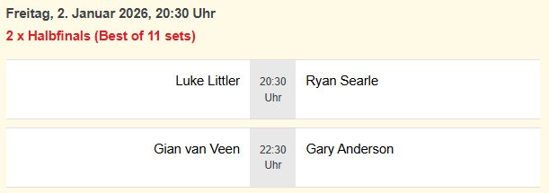 Die Darts-WM 2026 erreicht ihren emotionalen Höhepunkt: Zwei Halbfinals, vier Spieler und nur ein Ziel – das große Finale. Auf höchstem Niveau lieferten sich die Halbfinalisten intensive Kopf-an-Kopf-Duelle, geprägt von nervenstarken Finishes, brillanten Averages und Momenten, die das Publikum von den Sitzen rissen. Jeder Dart war entscheidend, jeder Fehler riskant. Die Bühne ist bereitet – die Finalisten stehen fest und die Spannung könnte kaum größer sein.