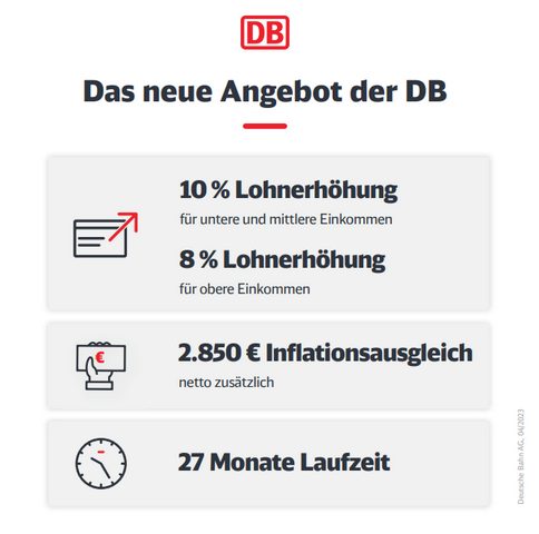 Personalvorstand Seiler: „Wir bieten 10 Prozent mehr fĂŒr untere und mittlere Lohngruppen, 8 Prozent fĂŒr obere und zusĂ€tzlich 2.850 Euro InflationsausgleichsprĂ€mie“ · DB kritisiert, dass die EVG Vorbedingungen stellt und immer noch nicht ernsthaft verhandeln will.