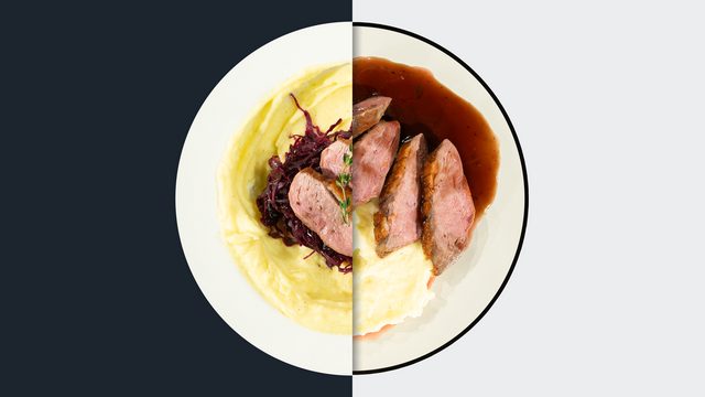 Auf der Haut gebratene Entenbrust mit Portweinsauce, Rotkohl und Kartoffelpüree