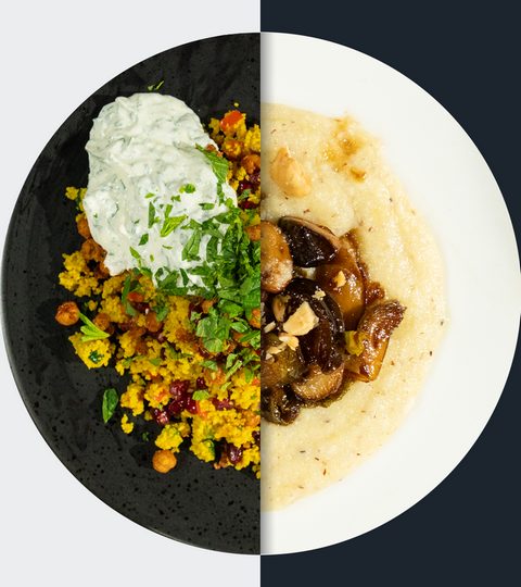 Cremige Polenta mit Haselnüssen und gebratenem Rosenkohl-Pilz-Gemüse