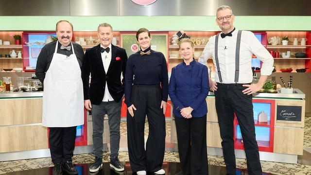 Viktoria Fuchs bittet die Profiköche Johann Lafer, Karlheinz Hauser, Cornelia Poletto und Thomas Martin, ein Silvestermenü zu zubereiten.