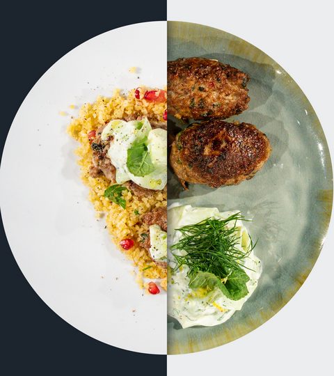Gebratene Lammköfte mit Tomaten-Bulgur-Salat und Joghurt-Minz-Gurkenröllchen