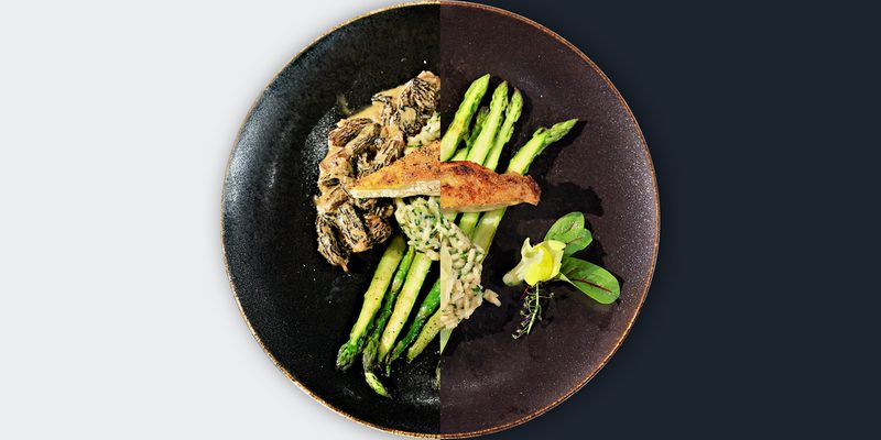 Gebratene Perlhuhnbrust mit Frühlingskräuter-Risotto, gebratenem grünen Spargel und Morchelrahm (Rezept zum Download)