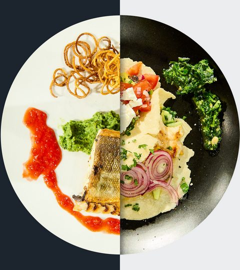 Gebratener Kabeljau mit Erbsen-Minz-Püree, Erdbeer-Chili-Sauce und Kartoffelstroh