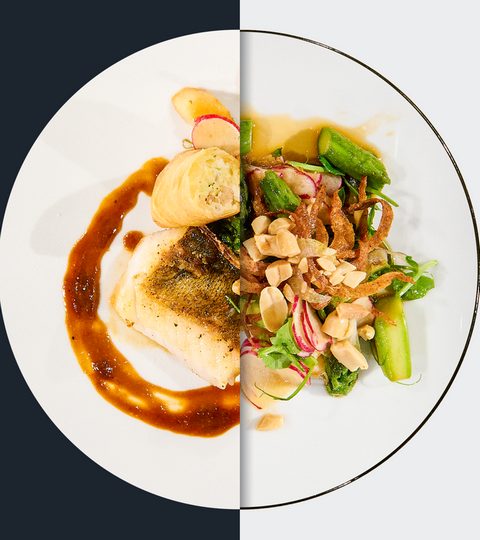 Gebratenes Zanderfilet mit Miso-Soja-Marinade, asiatischem Spargelsalat, Krabben-Röllchen und Röstzwiebeln