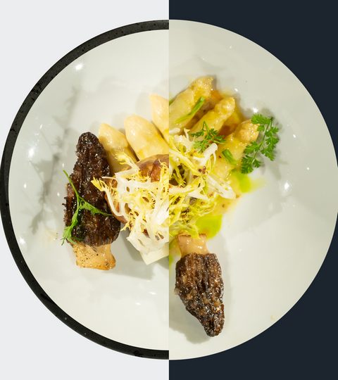 Gedämpfter Kabeljau mit glasierten Dashi-Morcheln, Spargel und Frisée