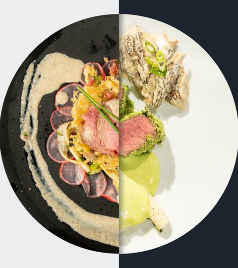 Kalbsrücken im Panko-Schnittlauch-Mantel mit sous-vide gegartem weißen Spargel, Erbsen-Hollandaise, Morchel-Rahm und Radieschen-Kartoffelsalat