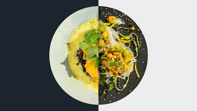 Gebratene Garnele mit Belugalinsen, Kokos-Curry-Schaum und Mango-Chili-Salat
