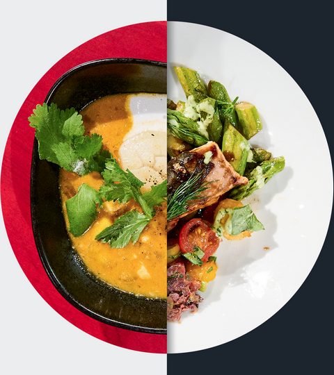 Gebratener Lachs mit asiatischem Lack, Tomaten-Spargel-GemĂŒse mit Sucuk und knusprigen Mozzarella-BĂ€llchen mit Basilikum-Mayonnaise