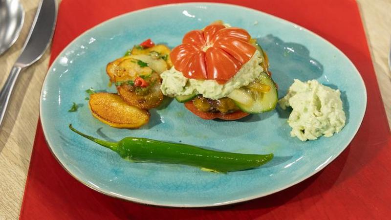 Tomaten-Burger mit Avocadocreme, karamellisierten Zwiebeln und feurigen Bratkartoffeln (Foto)