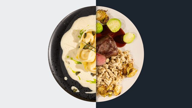 Rehrücken mit Portweinjus, zweierlei Rosenkohl und Haselnuss-Knöpfle