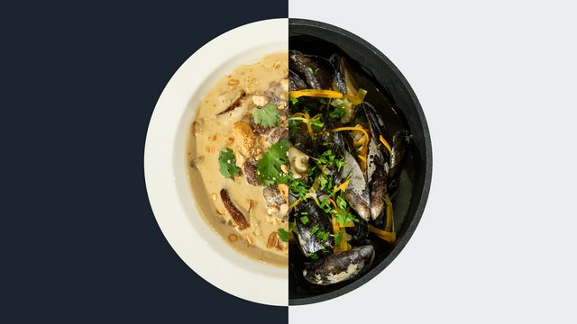 Moules-frites: Miesmuscheln in WeiĂwein-WurzelgemĂŒse-Sud mit Pommes frites und Knoblauch-Mayonnaise(kocht das Gericht von Oliver)