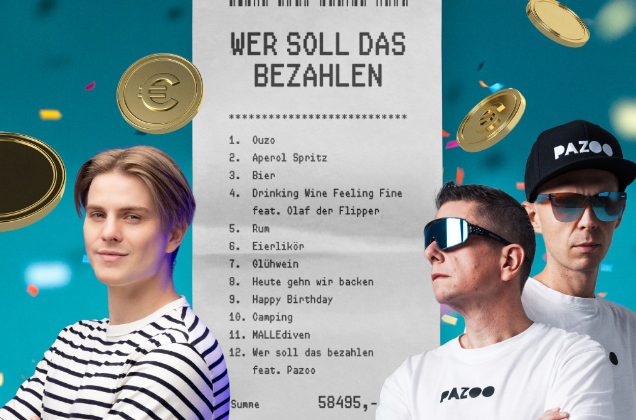 Aber genau wie die kältere Jahreszeit eine unabdingbare Realität ist, so gilt das auch für die Rechnung. Vincent Gross kanalisiert seinen inneren Jupp Schmitz und zitiert den karnevalistischen kölschen Evergreen „Wer soll das bezahlen?“, der sich über die Jahrzehnte seit 1950 mit unzähligen Coverversionen auch außerhalb des Karnevals zu einem der meistgesungenen deutschsprachigen Schlager entwickelte. Allerdings performt Vincent Gross den Klassiker in seinem ganz eigenen Stil, beziehungsweise mit prominenter Schützenhilfe. Der Partyzoo aus Österreich, das erfolgreiche Mash-Up DJ-Duo Pazoo begab sich an die Teller um das Problem mit den leeren Gläsern zu klären.