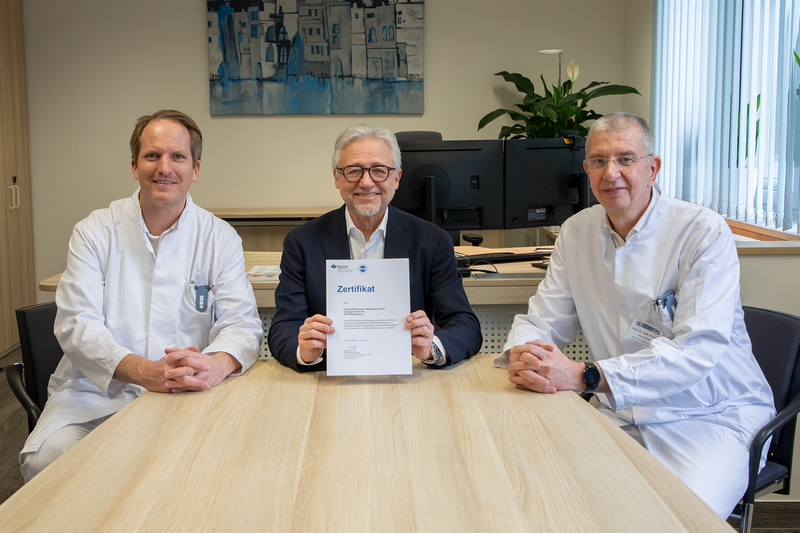 Foto: v.l.: Dr. Jan Philipp Schüttrumpf, Oberarzt der Universitätsklinik für Unfallchirurgie, Prof. Dr. Hans-Jochen Heinze, Ärztlicher Direktor des Universitätsklinikums Magdeburg sowie Prof. Dr. Stefan Piatek, Direktor der Universitätsklinik für Unfallchirurgie, freuen sich über die erfolgreiche Zertifizierung.