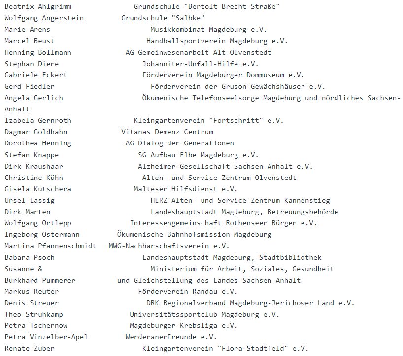 In diesem Jahr wurden 32 Magdeburgerinnen und Magdeburger mit dem FreiwilligenPass ausgezeichnet. Besonders erfreulich sind die zwei Auszeichnungen in der Kategorie „Engagierte Jugendliche“ sowie von Herrn Stefan Knappe, der sich trotz eigener Beeinträchtigungen stark engagiert.