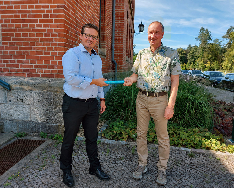 AnlĂ€sslich des Dienstantrittes hatte der Leiter der Ăbergangszeit, Frank Hoffmann (Foto r.), den symbolischen „Staffelstab“ an Stefan Matz ĂŒbergeben. Im Rahmen einer kurzen Ansprache bedankte sich der neue Betriebsleiter fĂŒr das Engagement und die Bereitschaft Frank Hoffmanns, den Eigenbetrieb vorĂŒbergehend mit vollem Einsatz gefĂŒhrt und damit die Weichen fĂŒr die kĂŒnftige Arbeit des Betriebs gestellt zu haben.