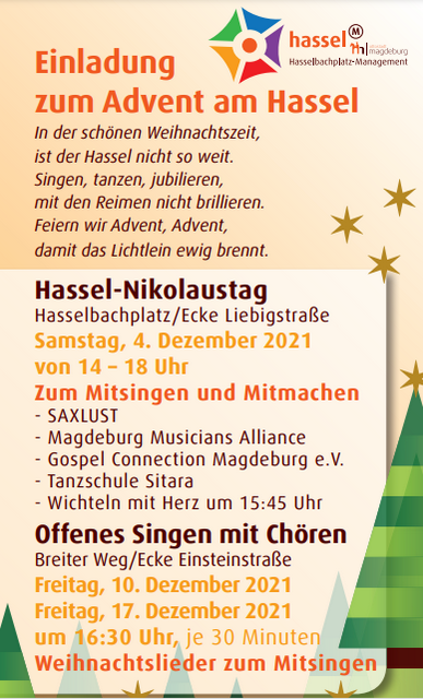 Um 16.00 Uhr lädt die Gospel Connection Magdeburg e.V. zum Mitsingen ein. Liedertexte werden gestellt. „Anschließend strahlen, säuseln, schnattern, schmeicheln und streicheln Saxofontöne der Gruppe „SaxLust – Ultraschall & Zwischentöne“ die Seele und das Gehör“, macht Marianne Tritz Lust auf den Advent am Hassel.