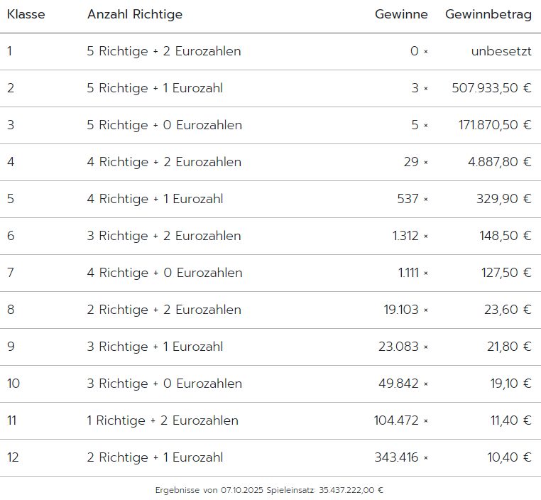 Die GlĂŒckszahlen und Gewinnquoten vom Dienstag den 07. Oktober 2025