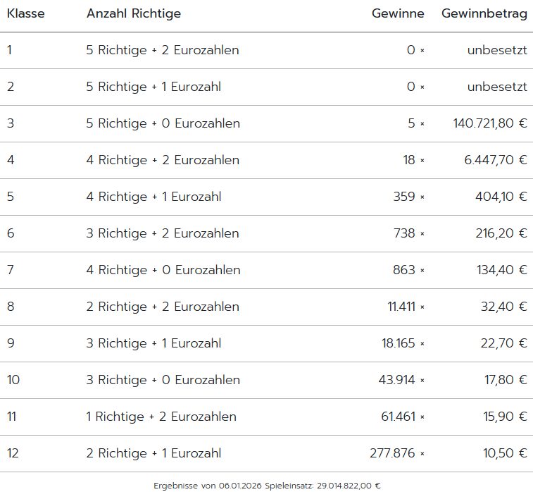 Die Glückszahlen und Gewinnquoten vom Dienstag den 06. Januar 2026