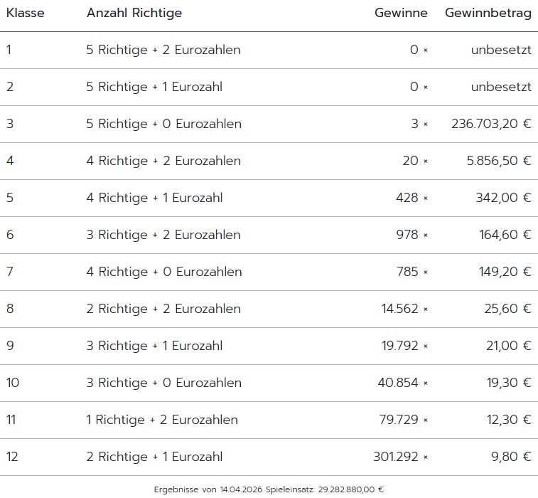 Die Glückszahlen und Gewinnquoten vom Dienstag den 14. April 2026