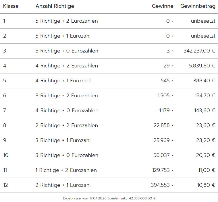 Die Glückszahlen und Gewinnquoten vom Freitag den 17.04.2026