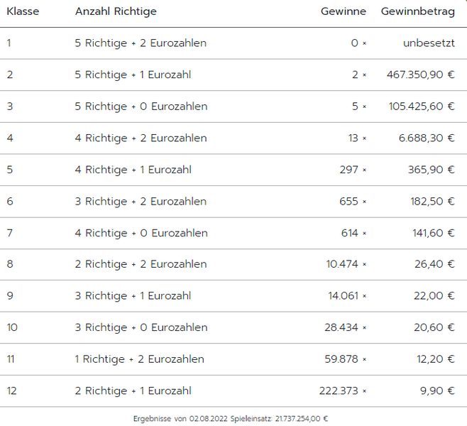 Die GlĂŒckszahlen und Gewinnquoten vom Dienstag den 02.08.2022