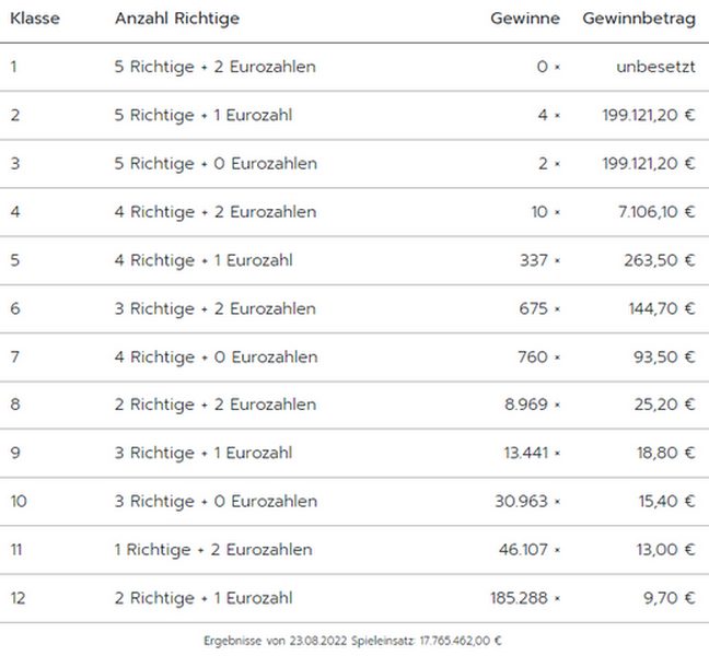 Die GlĂŒckszahlen und Gewinnquoten vom Dienstag den 23.08.2022