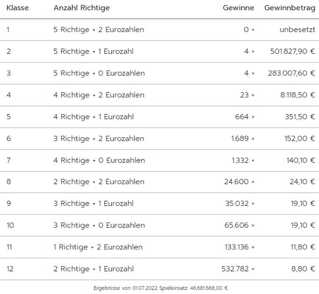 2 Juli 2022 Eurojackpot: Zahlen & Quoten (Freitags-Ziehung) von pdppredaktion | Veröffentlicht in: Glücksspiel | 0 Die Glückszahlen und Gewinnquoten vom Freitag den 01. Juli 2022(alle Angaben ohne Gewähr)(c) EurojackpotGewinnquoten: