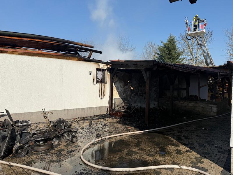 Feuerwehr im Einsatz: Gartenhaus, Carport und Fassade der Hauswand brennen