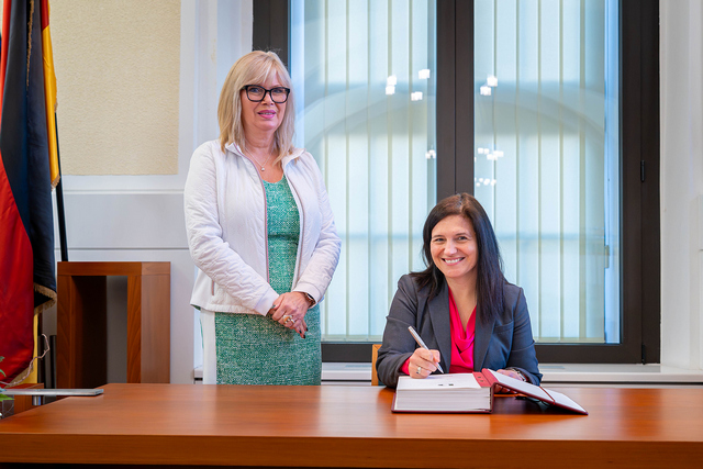 Foto: Oberbürgermeisterin Simone Borris (li.) und die Diplomatin Jodi Breisler (re.) bei der Gästebucheintragung im Eike-von-Repgow-Saal des Alten Rathauses Magdeburg.
