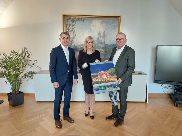 Bildunterschrift: ÖSA-Vorstandsmitglied David Bartusch (li.) und Frank Meyer, Abteilungsdirektor Kommunen und Wohnungswirtschaft (re.) übergaben den ÖSA-Kalender für 2026 an Magdeburgs Oberbürgermeisterin Simone Borris. (Foto: ÖSA)