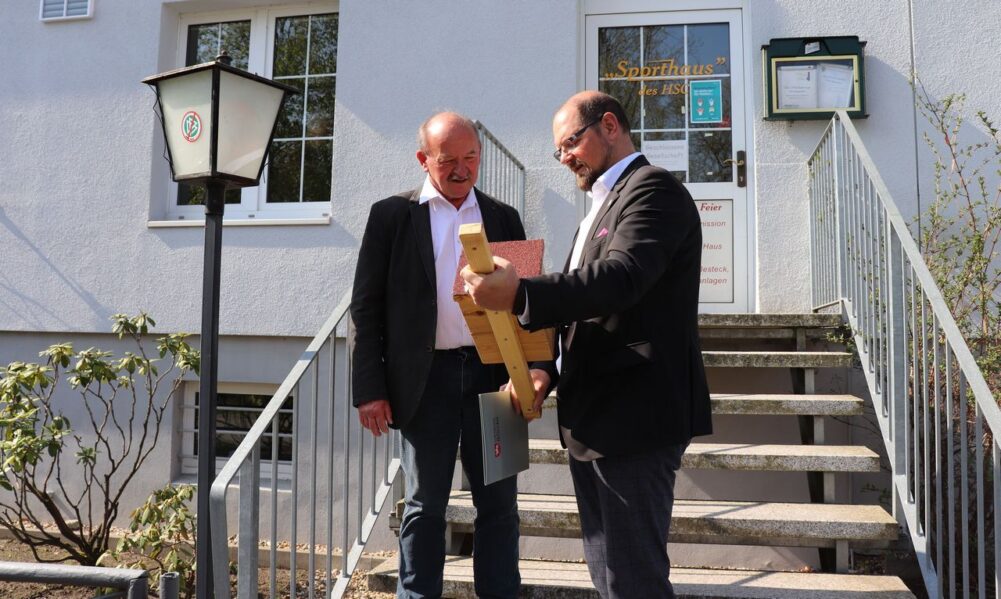 Foto: Landrat Martin Stichnoth verabschiedet vor dem Vereinsheim des Haldensleber Sportclubs Kreissportbundgeschäftsführer Hartmut Baethge in den Ruhestand. © Landkreis Börde
