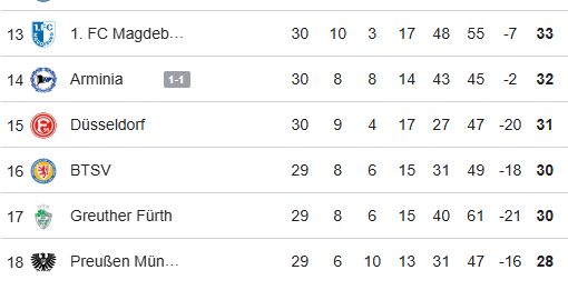 Die Magdeburger haben nach dem 2:0-Sieg nun fünf Punkte mehr als die Fortuna, der bei für sie schlechtem Verlauf der Sonntagsspiele sogar der Sturz auf den letzten Tabellenplatz droht.