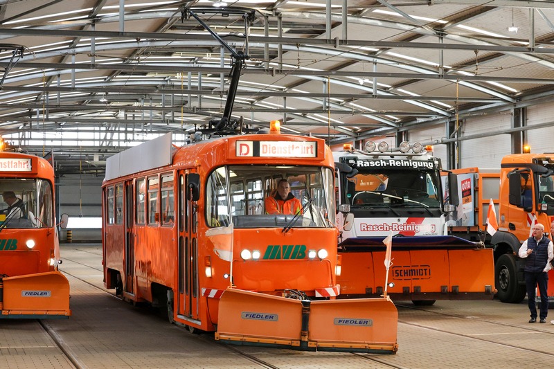 Das Hauptaugenmerk der MVB liegt auf der Betriebsfähigkeit des Straßenbahnnetzes. Insgesamt rund 140 Kilometer Gleise müssen schneefrei gehalten werden. Zwei schienengebundene Schneepflüge mit hydraulischen Räumschildern stehen dafür bereit. Sie wurden in den eigenen Werkstätten aus ehemaligen Tatra-Straßenbahnen umgebaut. „Speziell geschulte Kolleginnen und Kollegen steuern diese Fahrzeuge in Zweier-Teams. Über 60 Mitarbeitende sind dafür eingewiesen“, erklärt Michael Fürste.