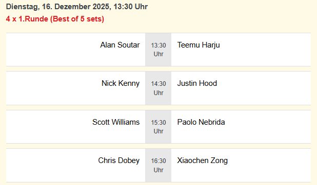 SPORT1 setzt die lange Darts-Tradition fort und ĂŒbertrĂ€gt die PDC Darts-Weltmeisterschaft zum 22. Mal live. Vom 11. Dezember 2025 bis zum 3. Januar 2026 verwandelt sich die legendĂ€re BĂŒhne des Londoner Alexandra Palace wieder in den Schauplatz fĂŒr die besten Dartsspieler der Welt. Titelverteidiger ist Luke Littler. Unter den diesmal 128 Startern befinden sich mit Martin Schindler, Gabriel Clemens, Ricardo Pietreczko, Max Hopp, Niko Springer, Dominik GrĂŒllich, Arno Merk und Lukas Wenig zum ersten Mal in der WM-Geschichte acht deutsche Teilnehmer. Auch die Anzahl der teilnehmenden Frauen ist historisch: Mit Publikumsliebling Fallon Sherrock, Beau Greaves, Noa-Lynn van Leuven, Lisa Ashton und Gemma Hayter sind erstmals fĂŒnf Frauen dabei.