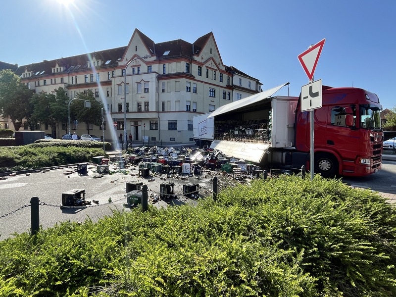 Durch eine Beschädigung am Sattelauflieger, welche auf bislang unbekannte Art und Weise entstanden ist, ist die Seitenklappe eines Lastkraftwagens in der Goethestraße in Stendal in einer Kurve aufgegangen. Aufgrund dessen hat der Lastkraftwagen den Großteil der Ladung, welche aus gefüllten Getränkekästen bestand, verloren. Die Kästen, inklusive der Flaschen wurden über die gesamte Fahrbahn verteilt. Die Bergung der Flaschen und der Kästen erfolgte durch die Freiwillige Feuerwehr und einen Abschleppdienst. Der Lastkraftwagen wurde in unmittelbarer Nähe abgestellt, um diesen vor Ort reparieren zu lassen.