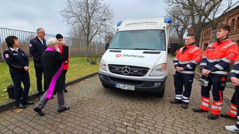 Ein besonderer Moment der Nikolausaktion war die Segnung des MalteserMobils. Mit dem Fahrzeug leisten die Malteser seit Juli 2025 mobile Obdachlosenhilfe in der Landeshauptstadt. Zweimal wöchentlich werden warme Mahlzeiten, Getränke und Hygieneartikel verteilt. Vor allem aber bieten die 17 Ehrenamtlichen und die beiden ehrenamtlichen Leitenden, die in wechselnder Besetzung mit dem Mobil unterwegs sind, Gespräche auf Augenhöhe und Informationen zu sozialer Unterstützung.