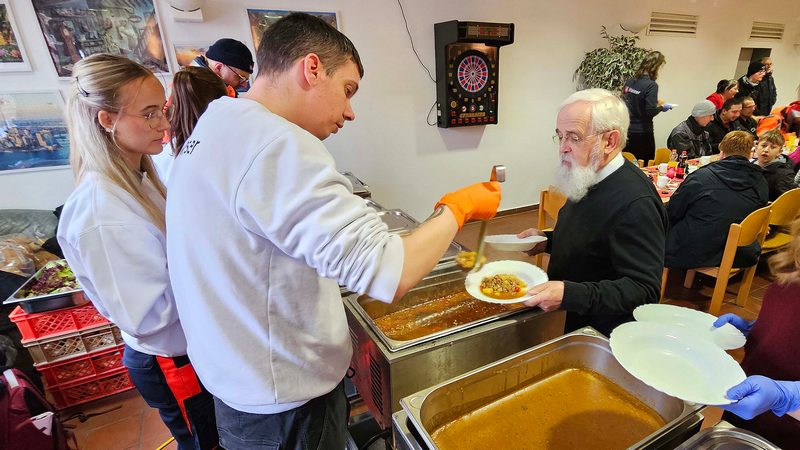 Im festlich dekorierten Saal des Jugend- und Sozialzentrums „Mutter Teresa“ erhielten rund 100 Menschen aller Altersgruppen ein warmes, mit viel Engagement zubereitetes Drei-Gänge-Menü und kamen miteinander ins Gespräch. Der Schirmherr der Aktion, Bischof Dr. Gerhard Feige, servierte gemeinsam mit Ehrenamtlichen – insbesondere aus der Malteser-Katastrophenschutzjugend – das Essen und setzte damit ein starkes Zeichen der Nähe und Solidarität. „Ich freue mich immer wieder darauf. Auf der einen Seite ist es natürlich traurig, dass so viele Menschen Unterstützung wie diese nötig haben. Aber dass man ihnen Freude bereiten kann und dass vor allem so viele mithelfen, finde ich beeindruckend – das ist ein Hoffnungszeichen“, sagte Bischof Feige.