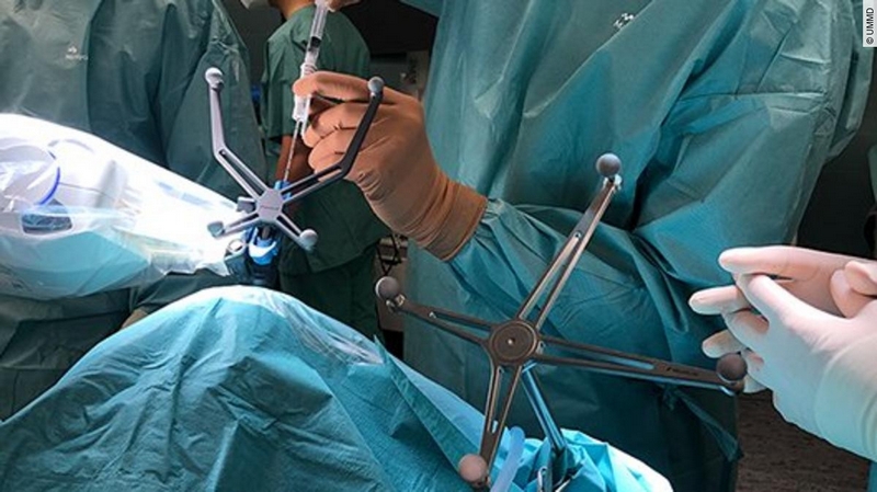 Foto: RobotergestĂŒtzte Hirnbiopsie rechts frontal subkortikal mittels Cirq System der Firma Brain Lab. Der Roboterarm kann automatisiert den Weg der Biopsie Nadel vorgeben, nachdem dieser vor dem Eingriff durch die Operierenden am MRT Scan des Patienten geplant wurde. (c) UMMD
