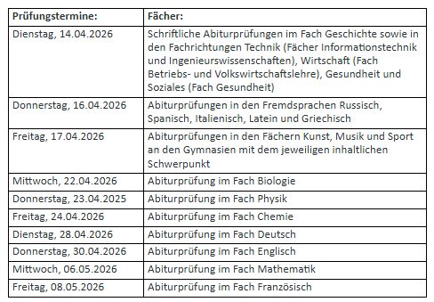 Der letzte Unterrichtstag vor den Prüfungen ist der 10. April 2026. Die schriftlichen Prüfungen starten am 14. April 2026 im Fach Geschichte sowie in den Fachrichtungen Technik, Wirtschaft, Gesundheit und Soziales. Die schriftlichen Abiturprüfungen enden am 8. Mai mit dem Fach Französisch. Ab dem 11. Mai können nach den schulischen Planungen die mündlichen Prüfungen beginnen. Die Zeugnisse der Allgemeinen Hochschulreife werden bis zum 3. Juli an die erfolgreichen Absolventen ausgegeben.