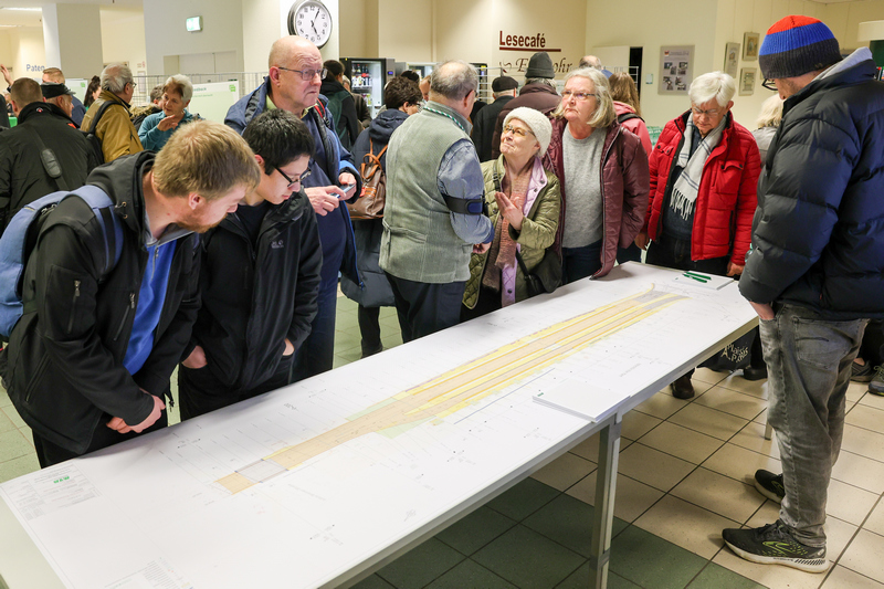 Vor Ort standen unter anderem Vertreterinnen und Vertreter aus den Bereichen Gleisbau, Projektkommunikation, Marketing und Service für Gespräche bereit. Auch die Geschäftsführung nutzte die Gelegenheit zum direkten Austausch mit den Bürgerinnen und Bürgern. Darüber hinaus wurde über angrenzende Projekte wie die anstehende Querung der B1 im Rahmen der 2. Nord-Süd-Verbindung informiert.