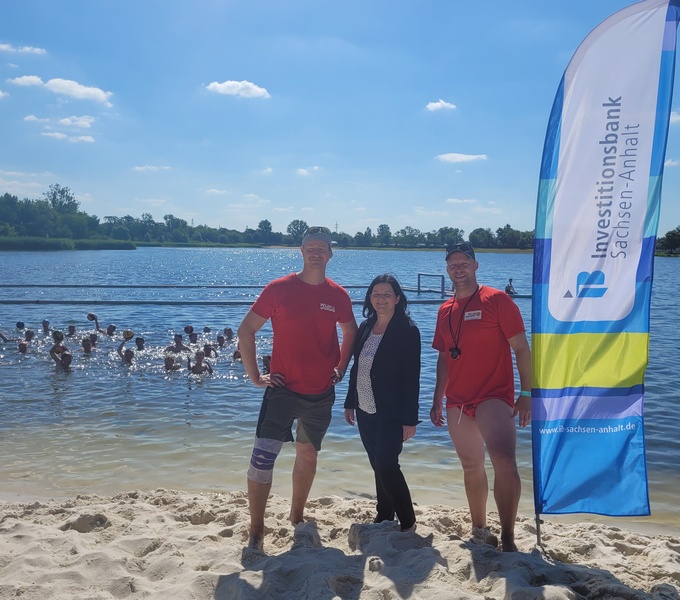 Foto: In der Mitte Mandy Schmidt (Vorstand der Investitionsbank Sachsen-Anhalt (IB)), eingerahmt links vom stellvertretenden WUM-Vereinsvorsitzenden Tom Hagendorf und rechts vom WUM-Nachwuchstrainer Holger Dammbrück bei der am 25.06.2024 erfolgten symbolischen vor-Ort-Übergabe der Finanzmittel im Trainingslager Cable Island am Neustädter See in Magdeburg. (c) Kathrin Mollenhauer