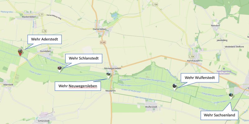 Aufgrund der länger anhaltenden und noch zu erwartenden Trockenheit setzt der Landesbetrieb für Hochwasserschutz und Wasserwirtschaft (LHW) in Abstimmung mit dem Landkreis Börde jetzt die Wehre Aderstedt, Schlanstedt und Neuwegersleben im Großen Graben. Dadurch soll künftiges Niederschlagswasser in der Fläche gehalten und der Wasserhaushalt im Naturschutzgebiet „Großes Bruch bei Wulferstedt“ verbessert werden. Die Wehre Sachsenland und Wulferstedt sind bereits seit geraumer Zeit in Betrieb.