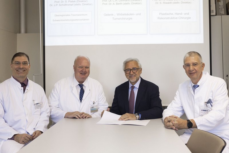 Foto: Prof. Dr. med. Armin Kraus, Direktor (Komm.) der Universitätsklinik für Plastische, Ästhetische und Handchirurgie Magdeburg, Prof. Dr. med. Christoph Lohmann, Direktor der Orthopädischen Universitätsklinik Magdeburg, Prof. Dr. med. Hans-Jochen Heinze, Ärztlicher Direktor des Universitätsklinikums Magdeburg, sowie Prof. Dr. med. Stefan Piatek, Direktor der Universitätsklinik für Unfallchirurgie Magdeburg, setzten mit der Gründung des Zentrums für Muskuloskelettale Chirurgie neue Maßstäbe in der Patientenversorgung.